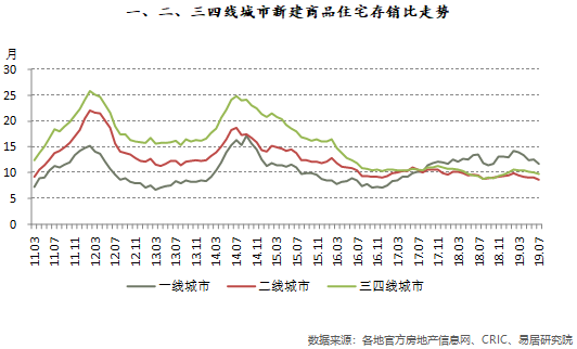 从结构分类来看,一线城市去库存周期最大。报告显示,7月份一、二、三四线100个城市新建商品住宅存销比分别为11.8、8.7和9.8个月。相比6月份12.6、9.2和10.1个月的数值,三类城市均有收窄。横向对比看,一线城市存销比数值最大,从这个角度看,一线城市房价涨幅相对会更小。
