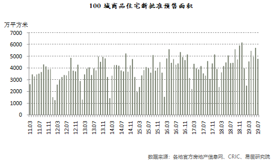 从100个城市预售情况来看,7月份淡季下推盘力度不大。报告显示,7月份100个城市新建商品住宅月度新批准预售面积为4810万平方米,环比下降16.3%,同比增长8.8%。