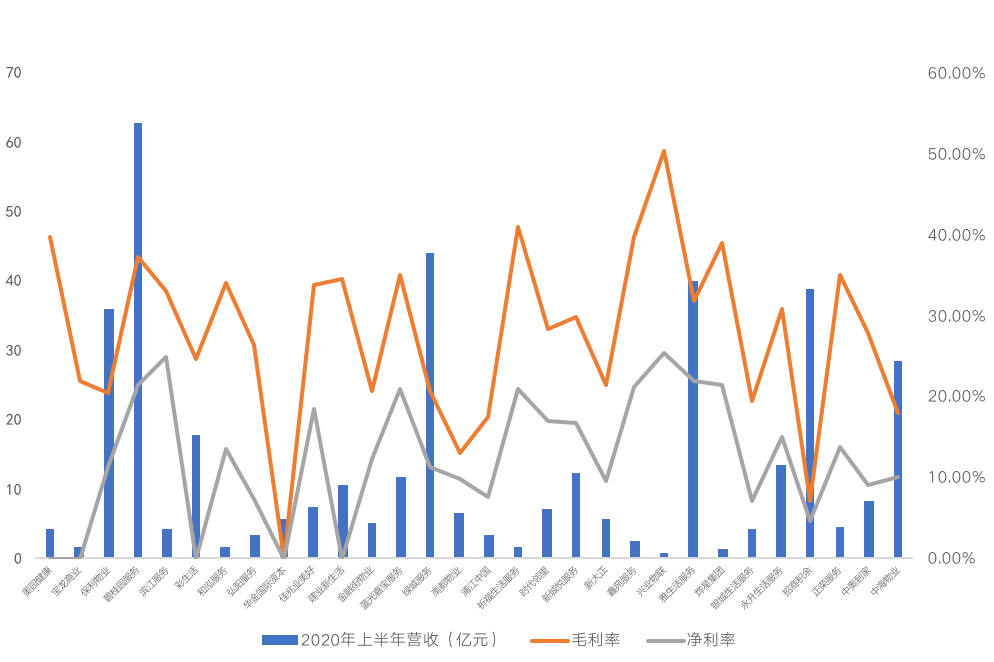 上半年,30家上市物企平均毛利率为28.69%,平均净利率为14.89%,其中迷你体量的兴业物联毛利率及净利率均位于上市物企榜首,主要与其业务来源相关。此外尚有奥园健康(6.57, -0.05, -0.76%)、碧桂园服务、滨江服务(16.64, -0.12, -0.72%)等13家物企毛利率高于3成,其中建业新生活(9.26, -0.48, -4.93%)、烨星集团(1.39, -0.02, -1.42%)及正荣服务(5.69, -0.23, -3.89%)均为2020年新上市物企。