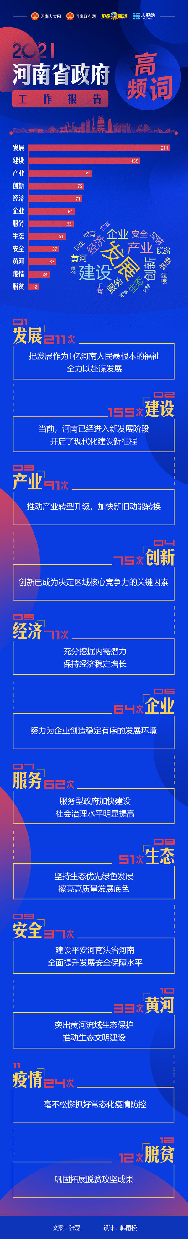 1月18日上午,河南省十三届人大四次会议在河南人民会堂召开,省长尹弘作《政府工作报告》。对《政府工作报告》全文进行词频分析,发现“发展、建设、创新、服务……”这些高频词位居前列。