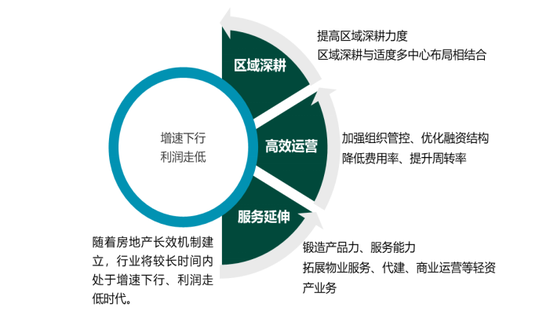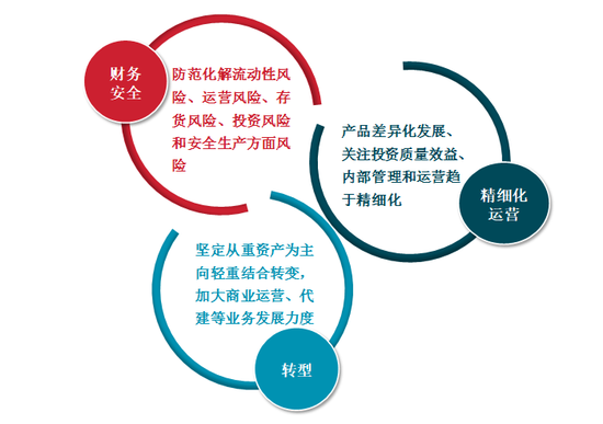 地价高企和房地产去金融化限制了房企盈利空间,行业长期处于低利润时代。长期来看,房地产行业长效机制逐步建立,房地产金融审慎监管框架下,房地产逐步进入去金融化通道,行业利润率可能保持在更低的水平。房企需调整经营方式,发挥综合运营优势,适应行业调整周期。当前,部分高存货、高周转、高杠杆模式房企面临流动性危机,此种模式的弊端已经显现,房企需逐步改变经营模式,以适度杠杆、适量存货、高效运营维持业务高弹性,以适应极速分化的市场;同时适度发展轻资产业务,发挥运营优势,提升边际效益。