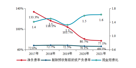 2021年百强企业规范经营、积极应对,通过提前偿还债务、调整债务结构等方式稳降杠杆,“三道红线”提出后应对更加从容,均值已经基本合规。百强企业剔除预收账款的资产负债率、净负债率的均值分别为69.5%、77.1%,较上年分别下降0.6、3.6个百分点;现金短债比为1.6,较上年上升0.1,整体稳中向好。
