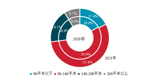 2021年首改和改善需求仍对房地产市场形成较大支撑,百强企业加大首置类产品的推出比例,支撑销售业绩的增长。从50家百强代表企业重点项目各面积段产品的销售额占比来看:90平米以下首置类产品的销售额占比为17.4%、较上年提升0.8个百分点;90-140平米首改类产品销售额占比达55.4%,较上年下降0.6个百分点;140-200平米改善类及200平米以上高端类产品销售额贡献率分别为18.5%、8.7%,较上年均下降0.1个百分点。