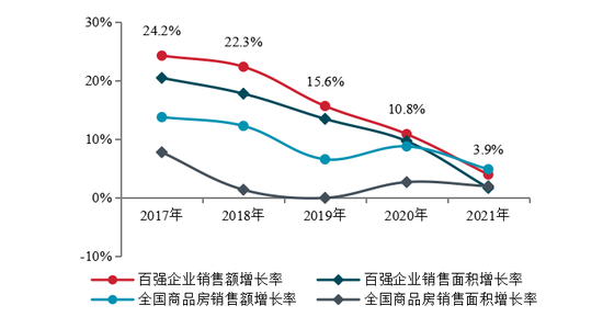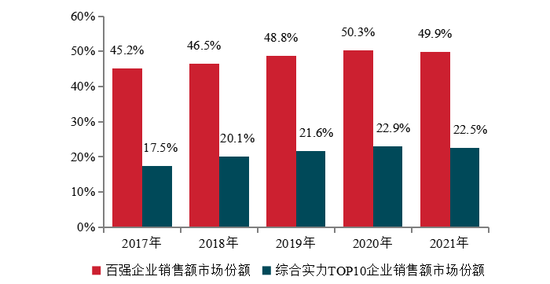 百强企业及综合实力TOP10企业2017-2021年市场份额