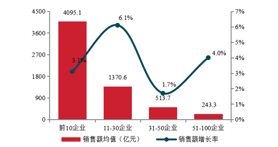 百强企业不同阵营2021年销售额及其增长率均值情况