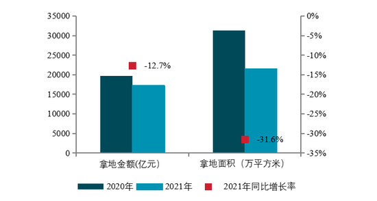 2021年住宅用地供应明显缩量,叠加政策调控和融资监管显效,全年百强企业投资规模明显缩量。50家百强代表企业全年拿地金额总量同比减少12.7%,其中招拍挂市场的拿地金额16804.8亿元,占全国300城土地出让金的29.4%,同比下降0.5个百分点。