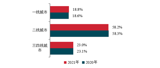 2021年,百强企业继续深耕重点城市,二线城市仍是主要销售来源。一线城市受新房供应规模加大的影响,在旺盛需求的带动下市场成交规模增长,销售额占比小幅上升0.2个百分点至18.8%;二线城市占比为58.2%,仍是主要销售来源;三四线城市销售额占比23.0%。