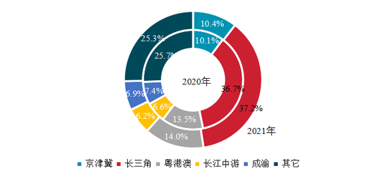 百强企业聚焦核心城市群,长三角、粤港澳、京津冀三大城市群销售贡献突出,合计占比超六成。50家百强代表企业销售结构中,五个主要城市群销售占比合计达74.7%,同比增长0.4个百分点。